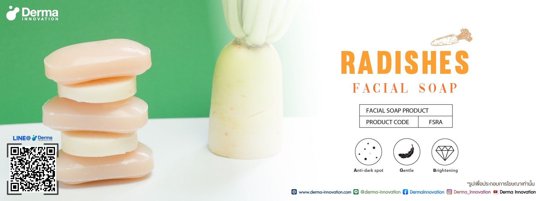 Radishes Facial Soap สบู่ทำความสะอาดผิวหน้า ด้วยสารสกัดจากหัวไชเท้าที่ช่วยลดเลือนจุดด่างดำให้แลดูจางลง เผยผิวเนียนนุ่มด้วยสารสกัดจากน้ำมันรำข้าวที่อุดมไปด้วยวิตามิน E ช่วยให้ผิวเปล่งปลั่งอย่างเป็นธรรมชาติ