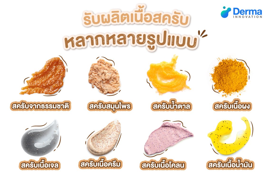 Derma Innovation รับผลิตสครับขัดผิวหลายรูปแบบไม่ว่าจะเป็น สครับจากธรรมชาติ สครับสมุนไพร หรือสครับน้ำตาล นอกจากนี้ยังมีเนื้อสัมผัสให้เลือกหลากหลาย ทั้งสครับเนื้อผง สครับเนื้อเจล สครับเนื้อครีม สครับเนื้อโคลน และ สครับเนื้อน้ำมัน เพื่อตอบโจทย์ทุกความต้องการของลูกค้า ครอบคลุมทุกสภาพผิว